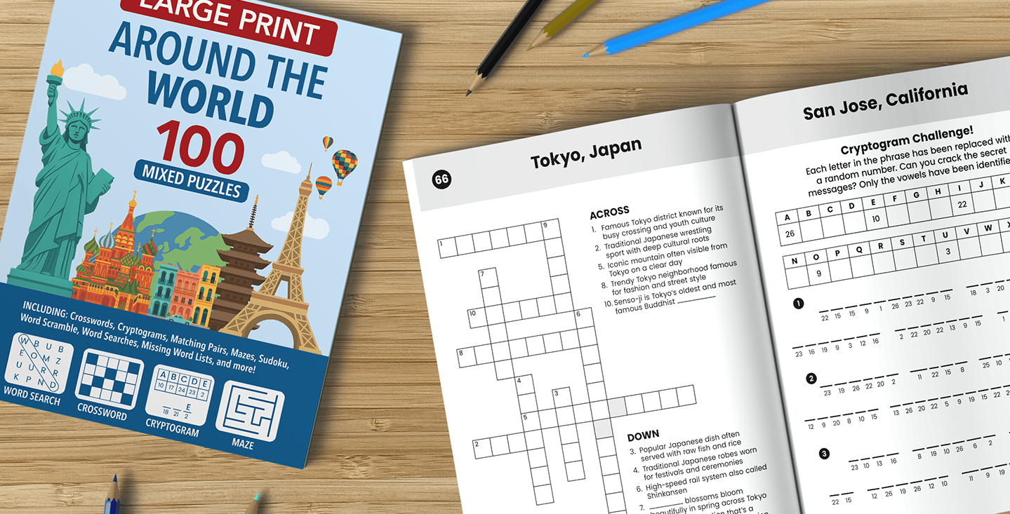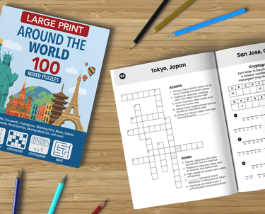 Take a trip around the world—one puzzle at a time! Discover the wonders of the world without leaving your home. This relaxing variety puzzle book features 100 exciting destinations, from the Eiffel Tower in Paris to the Great Wall of China. Each puzzle is carefully crafted to entertain and challenge your mind while offering a delightful cultural escape.