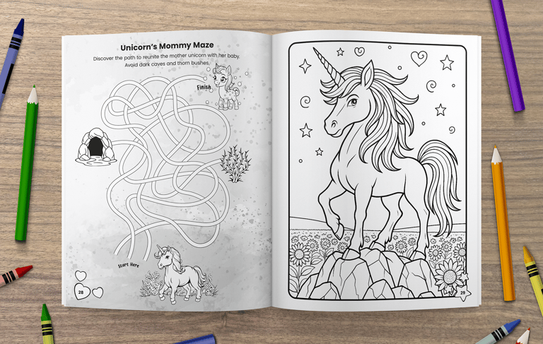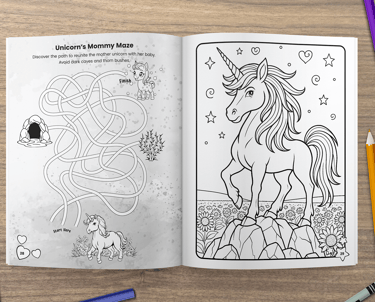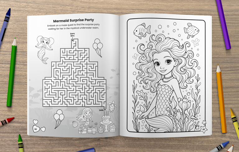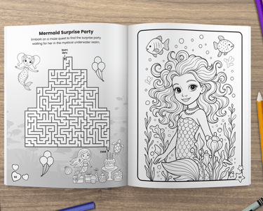 Get lost in the enchanted world of unicorns, mermaids, princesses, dragons, and fairies with challenging mazes and delightful coloring pages in this exciting activity book for kids! Challenge your observation skills and find out what doesn't belong under the sea and kingdom quests. And there's more with word search puzzles, crosswords, dot-to-dot, riddle challenges, and funny puns.